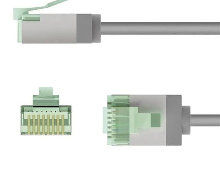 De superslanke CAT-kabels met extra korte connectoren verminderen drastisch het materiaalvolume in serverkasten en patchpanelen - voor aanzienlijk verbeterde luchtcirculatie en minder warmteontwikkeling dan bij conventionele bekabeling. Bovendien zorgen de zachte TPE-mantel en slanke koperen geleiders voor de speciale flexibiliteit en materiaalefficiëntie die deze kabelgeneratie tot de perfecte netwerkpartner maken.